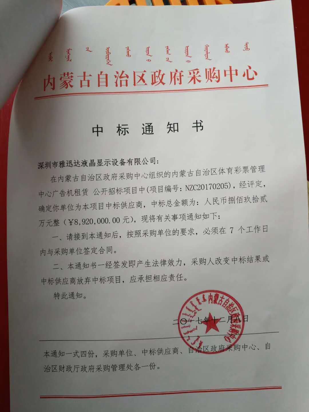 同時在我們歐陽平歐總經(jīng)理的帶領下在內蒙古自治區(qū)政府體育彩票管理中心廣告租賃公開招標中,在眾多競爭對手下通過企業(yè)本身的資質,公司成員不懈的努力成為內蒙古自治區(qū)政府體育彩票管理中心廣告租賃項目的供應商