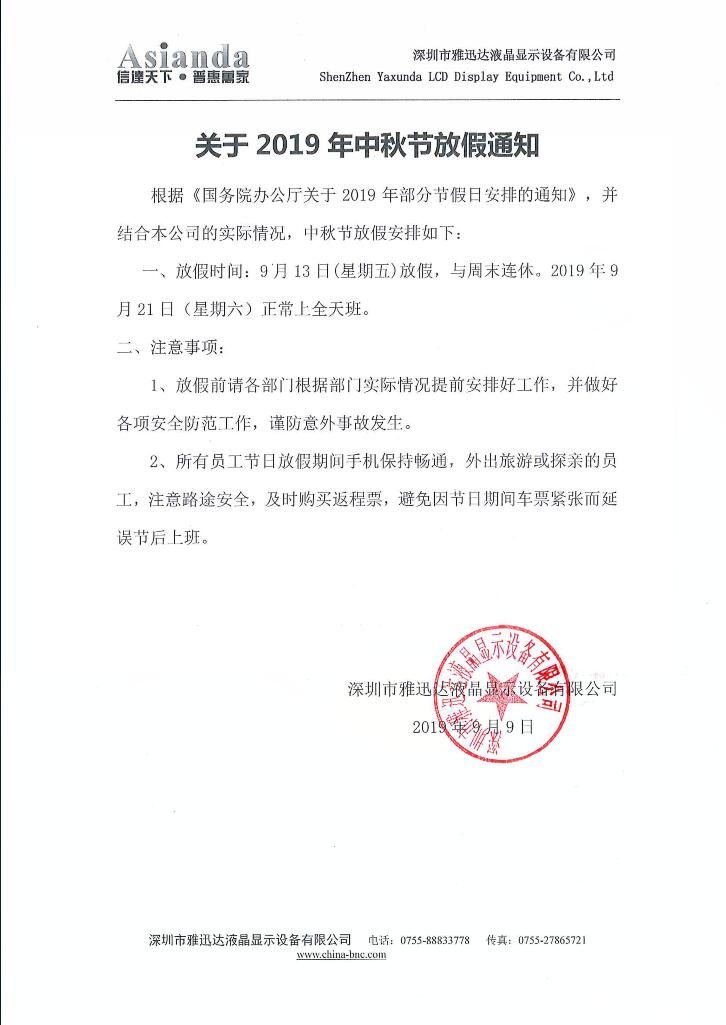 根據(jù)《國務(wù)院辦公廳關(guān)于2019年部分節(jié)假日安排的通知》,并結(jié)合本公司的實(shí)際情況,中秋節(jié)放假安排如下: