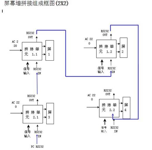 VGA視頻信號(hào)源(如PC)接到“VGA視頻分配器”的輸入端,“VGA視頻分配器”的輸出端分別連接各個(gè)拼接器的VGA輸入端。