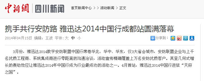 雅迅達(dá)中國(guó)行成都站活動(dòng)與成都2014安防展會(huì)同期舉行,在西南安防市場(chǎng)形成規(guī)模效應(yīng),成都當(dāng)?shù)孛襟w予以關(guān)注。報(bào)道中,眾媒體紛紛對(duì)雅迅達(dá)發(fā)布的新技術(shù)和展品展示極大興趣。