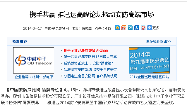 本次活動(dòng)由深圳市雅迅達(dá)液晶顯示設(shè)備有限公司獨(dú)家冠名,慧聰安防網(wǎng)主辦,深圳市佳信捷技術(shù)股份有限公司、廣東鉑亞信息技術(shù)股份有限公司、珠海市太川電子企業(yè)有限公司協(xié)辦?;顒?dòng)成功匯聚了政府、協(xié)會(huì)、專家、企業(yè)、工程商、系統(tǒng)集成商、大眾媒體等眾多資源到場(chǎng),共同迎接融合共贏新時(shí)代的來臨,也成功贏得安防權(quán)威網(wǎng)站的關(guān)注。